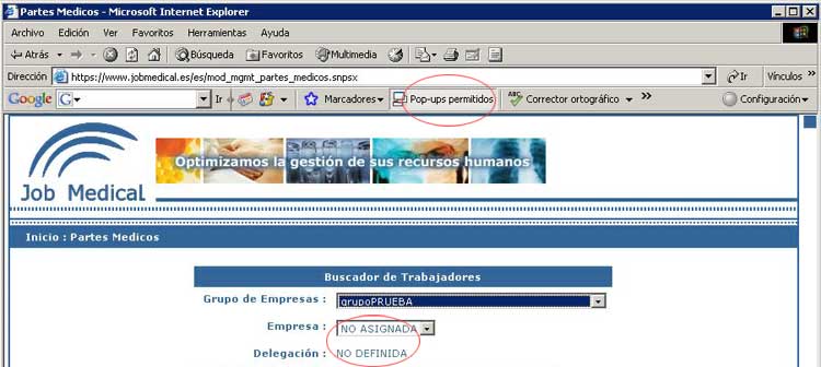 Existen aplicaciones o navegadores que bloquean las ventanas emergentes, por ejemplo la barra de google, esta aplicación debe estar configurada para que se permitan las ventanas emergentes de www.jobmedical.es , en IE7 automáticamente también puede bloquear las ventanas emergentes, habrá que configurarlo para que las permita en www.jobmedical.es